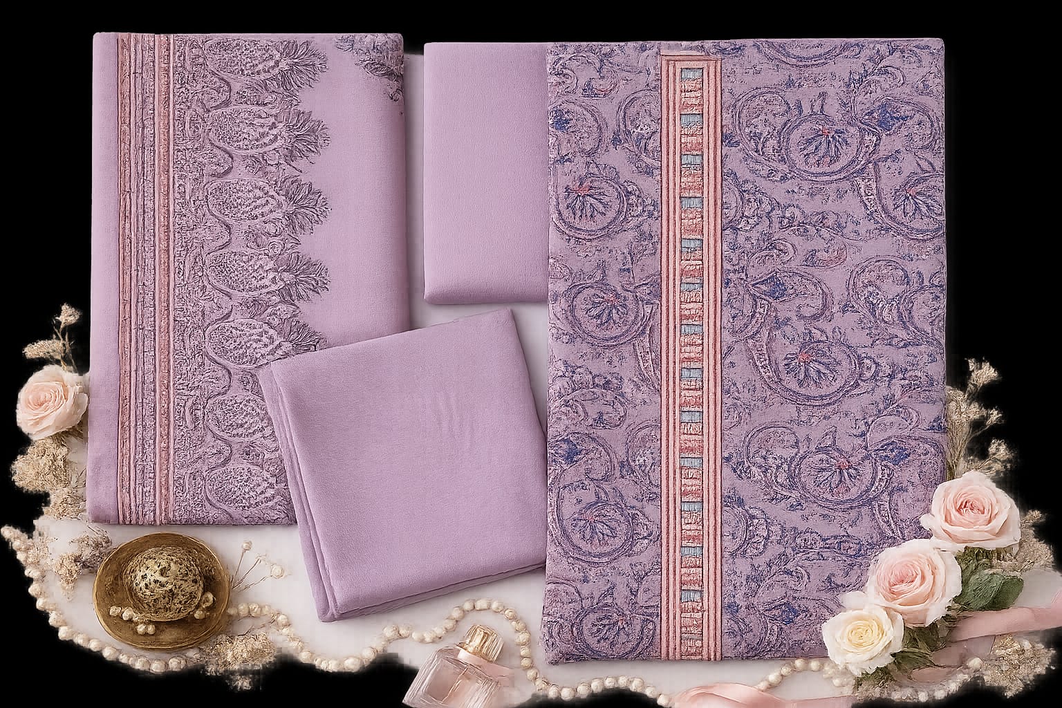 The set includes a beautifully detailed main fabric with delicate motifs, complemented by coordinated pieces that enhance its refined appeal. The soft texture ensures effortless draping, while the subtle interplay of pastel tones and fine detailing adds depth and elegance to the overall look.