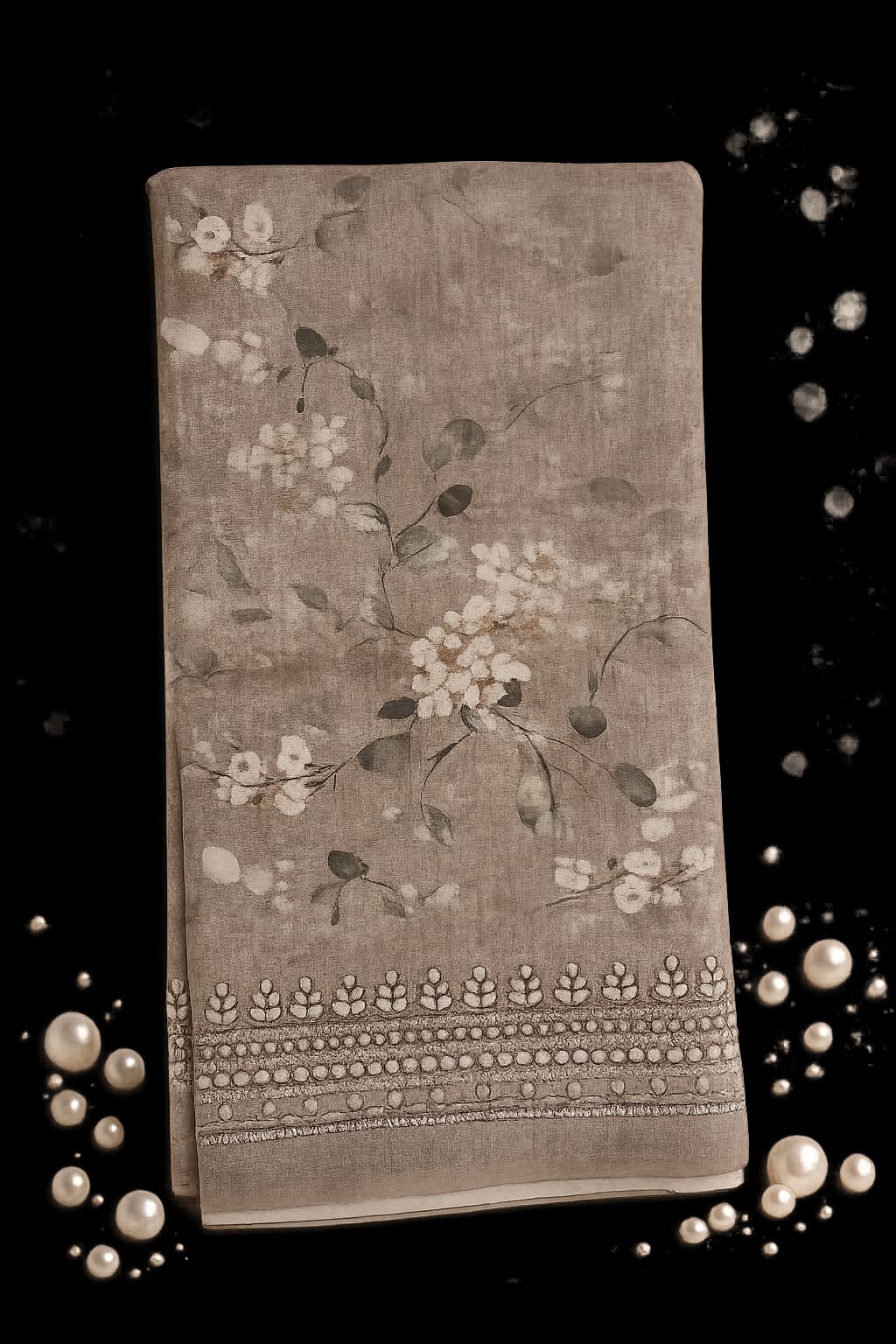 The highlight lies in its intricately detailed border, adorned with fine pearl-inspired embellishments and textured patterns that add a refined, festive touch without overwhelming the design. The fabric drapes gracefully, offering both comfort and sophistication—perfect for intimate celebrations, festive gatherings, or elegant day wear.