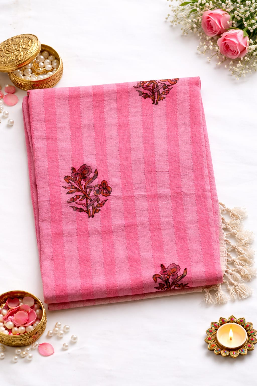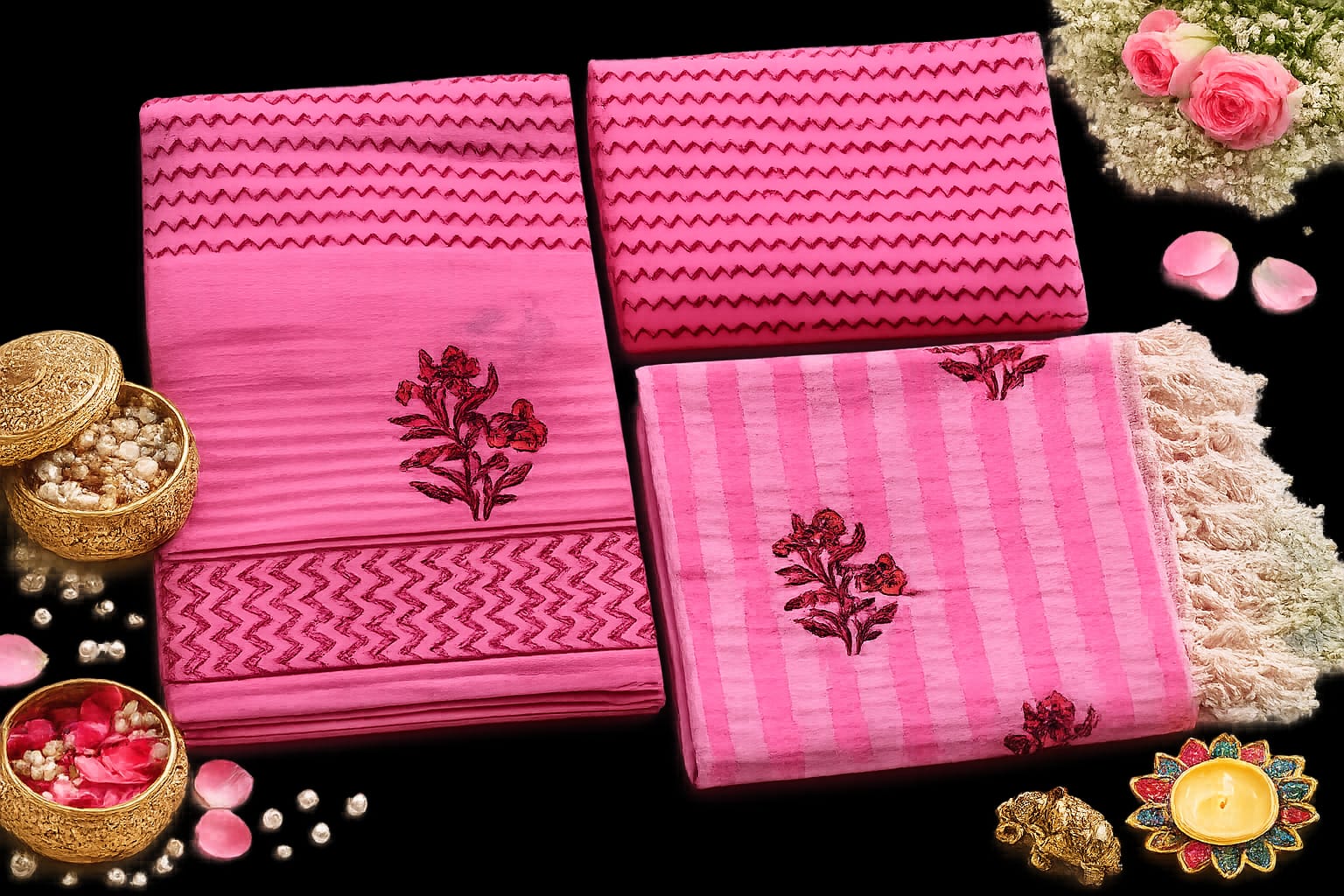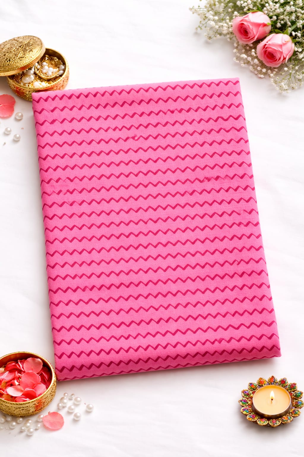 The kurta fabric features elegant zigzag detailing paired with a soft tonal base, enhanced by charming floral motifs that add a hint of sophistication. Complemented by a coordinated bottom and a stylish dupatta with textured stripes and floral prints, this set offers a perfect balance of comfort and style.