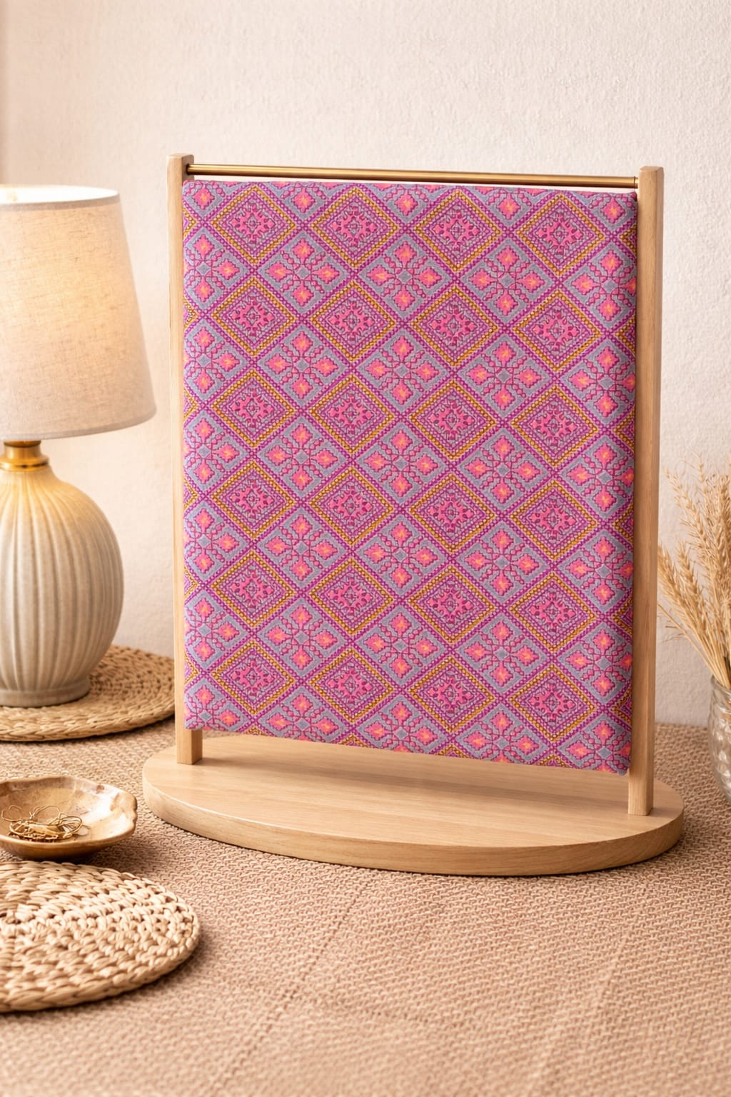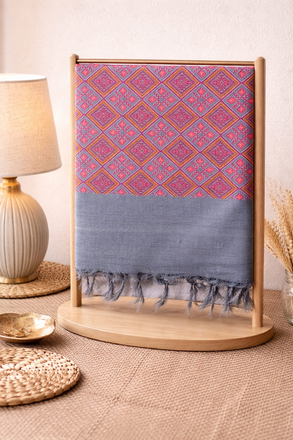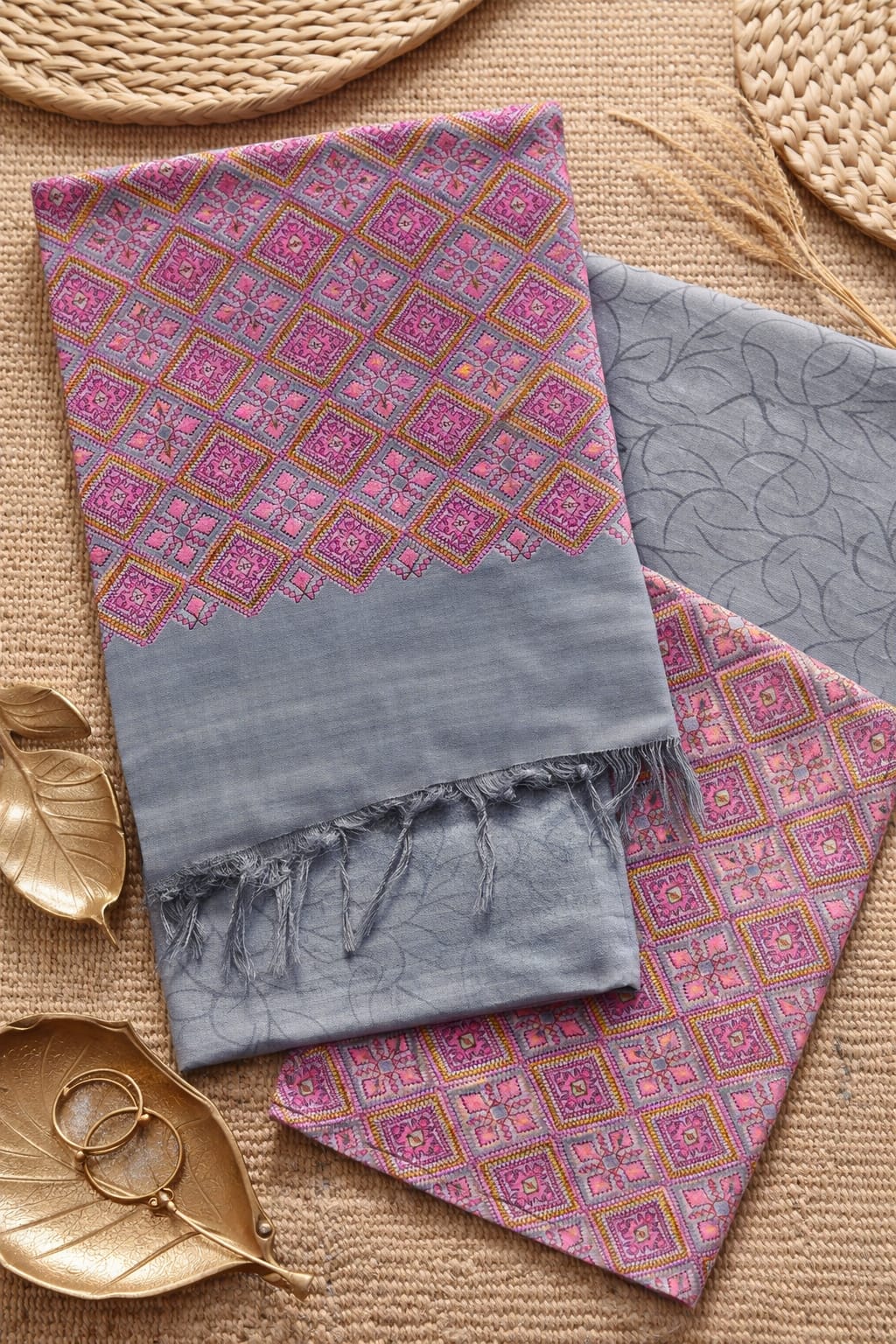 A graceful fusion of rosewood-inspired mosaic patterns and soft grey tones, this lightweight set brings effortless elegance with a touch of artisanal charm—perfect for both everyday sophistication and festive styling.